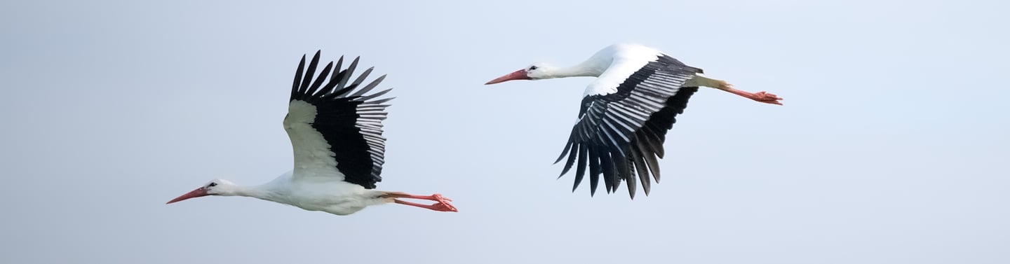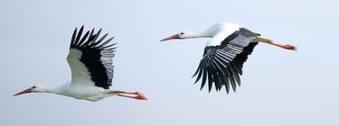 Deux Cigognes blanches (Ciconia ciconia) s'envolant vers le Nord lors de leur migration annuelle. Cette photo vaut 74 points individus sur le Baromètre, mais l'espèce en elle même vaut 207 points.